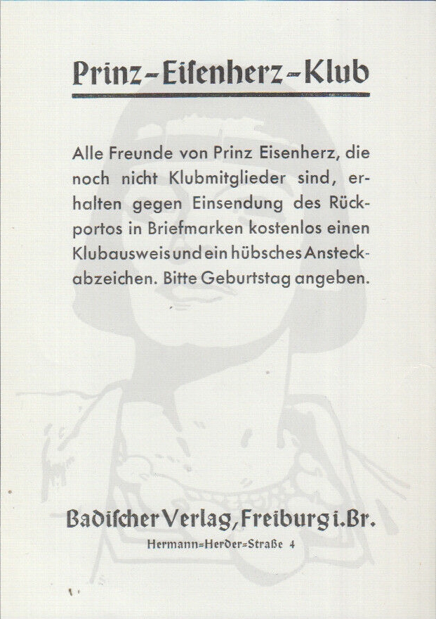 Auch gab es einen »Prinz-Eisenherz-Klub« des Badischen Verlags. Die Beilage in den Heften der »Illustrierte Woche« enthält den Hinweis auf das Ansteckabzeichen, das Sie oben links sehen.