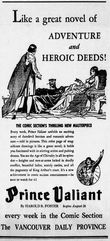Die Tageszeitung »The Democrat and Chronicle« aus Rochester, New York, veröffentlichte bereits sehr früh die „full pages“ von Prince Valiant (PV). Diese hier gezeigte Anzeige datiert vom 29. Juli 1937 und kündet den Start von PV in der Comic-Rubrik der nächsten Sonntagsausgabe am 1. August 1937 an. Das gezeigte Bild ist das erste Panel von Sonntagsseite #2.