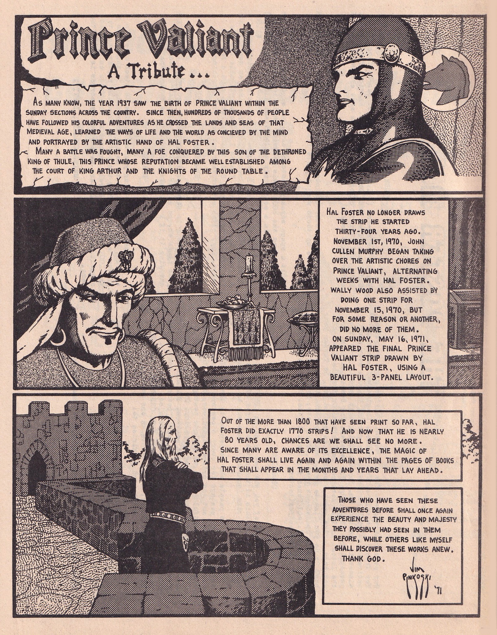 Damals im Jahr 1971 (als ich 21 war) schrieb und zeichnete ich diese Hommage an Hal Fosters PRINCE VALIANT – es wurde 1972 in The Comic Buyer's Guide #12 gedruckt (ich zeichnete auch das Cover dieser sehr frühen Ausgabe) – da war ich ein Fan und ein Sammler und ein aufstrebender Künstler, der von Fosters Meisterwerk tief beeindruckt war, und ich verbrachte viele, viele Stunden damit, jede Zeile und jedes Detail seines gesamten Laufs zu genießen … einschließlich der Art und Weise, wie er seine „Next Week“-Titel formulierte. …