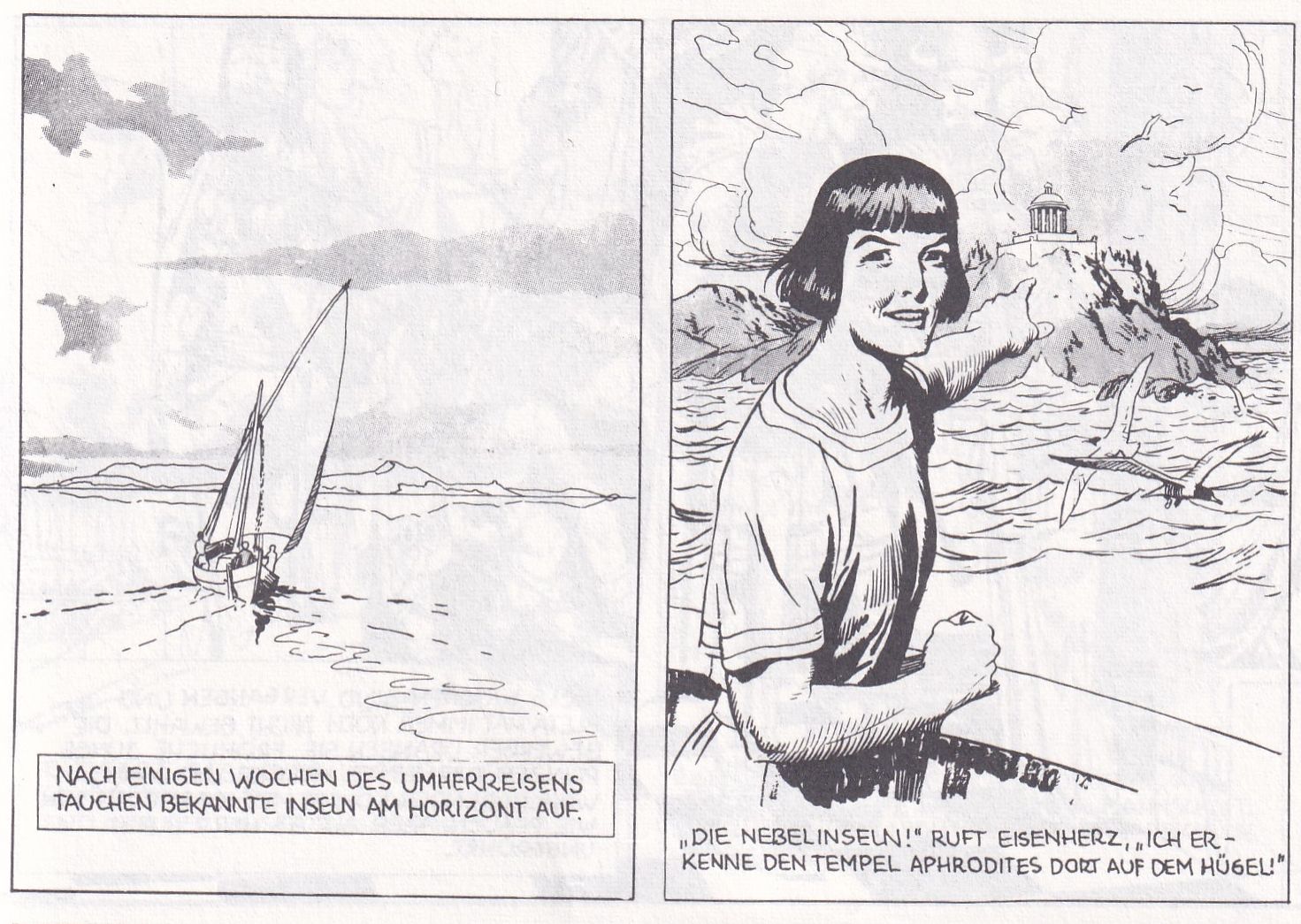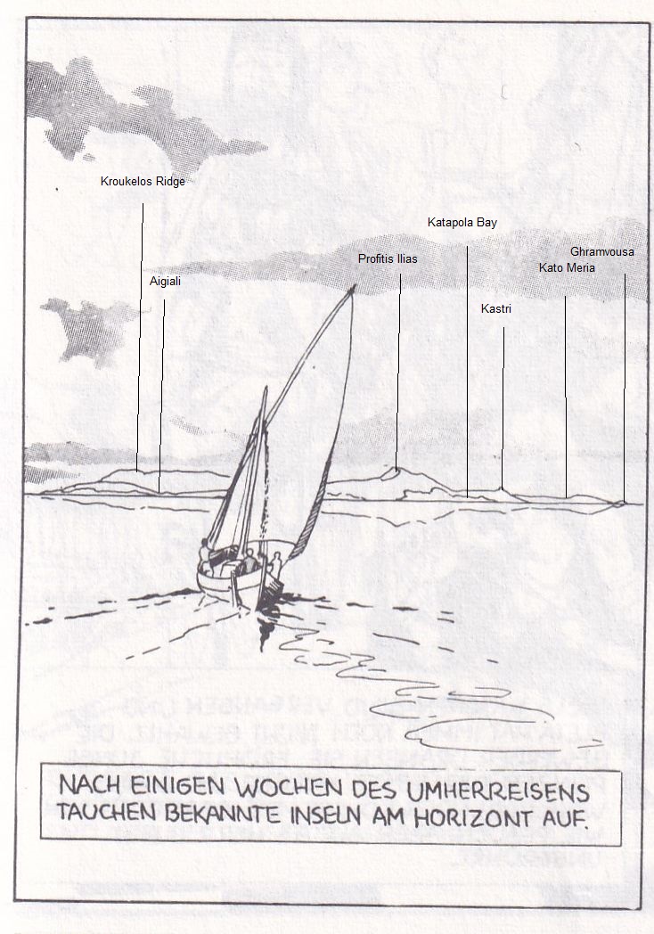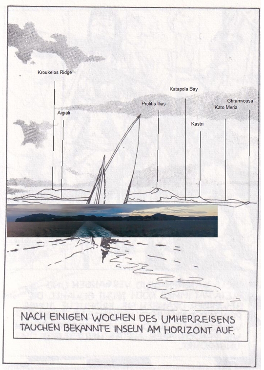 Ich glaube, ich habe einen Hinweis auf die genaue Verortung der Nebelinseln gefunden. Auf der Seite vom 29. Oktober 1944 (Bocola S.403) hat Hal Foster auf dem 4. Bild die Sichtung der Nebelinseln dargestellt. Die Konturen der gezeichneten Insel entsprechen bis ins Detail der Insel Amorgos, wenn man sich ihr von Westen nähert. Die Übereinstimmung mit einer entsprechenden Fotografie ist frappierend.
